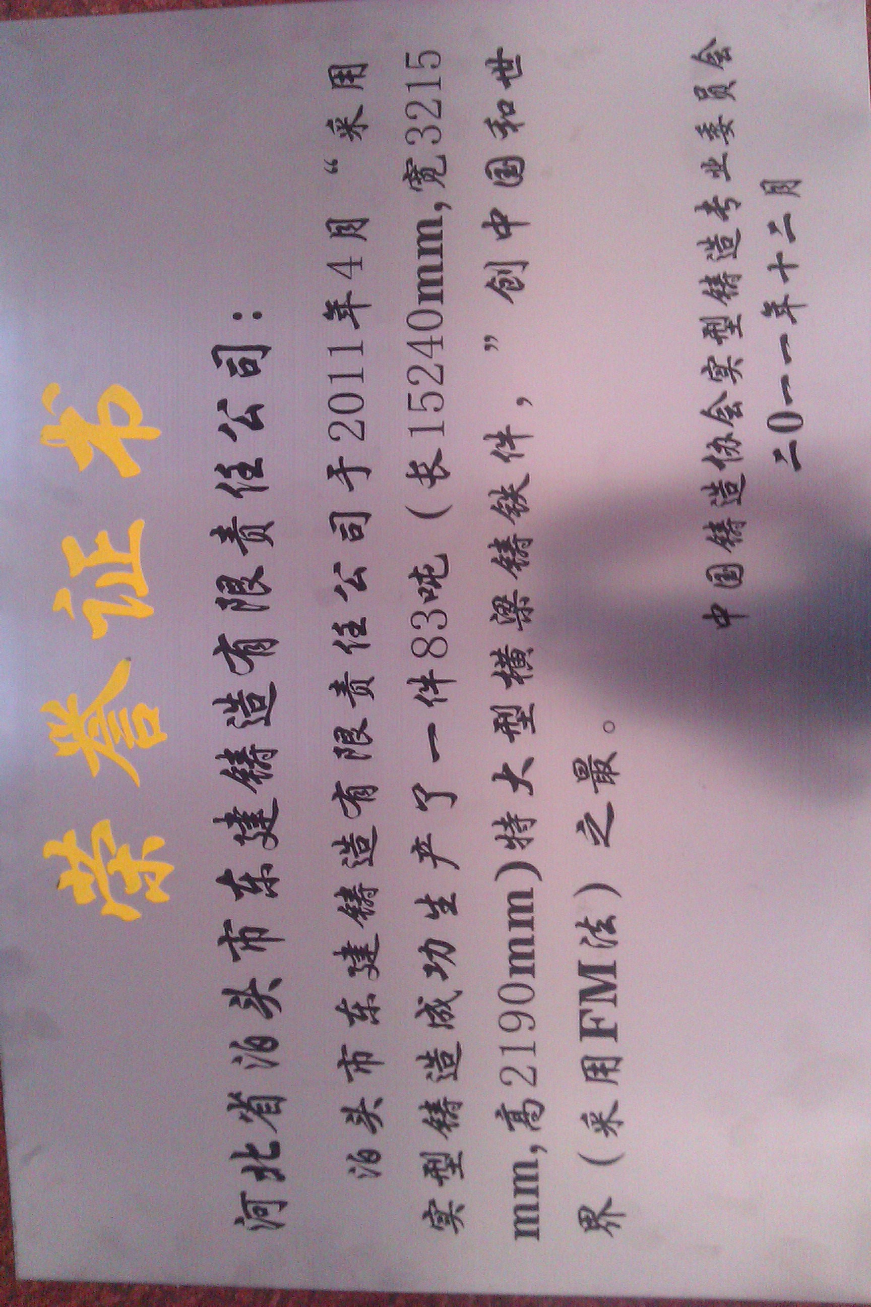 2011 年 12 月 27 日 ,在河北省泊頭市舉行了中國鑄造協(xié)會實型鑄造分會 企業(yè)榮譽證書頒發(fā)儀式。 近年來實型(消失模)鑄造了發(fā)展,泊頭市青峰機械有限公司和泊頭市東建...